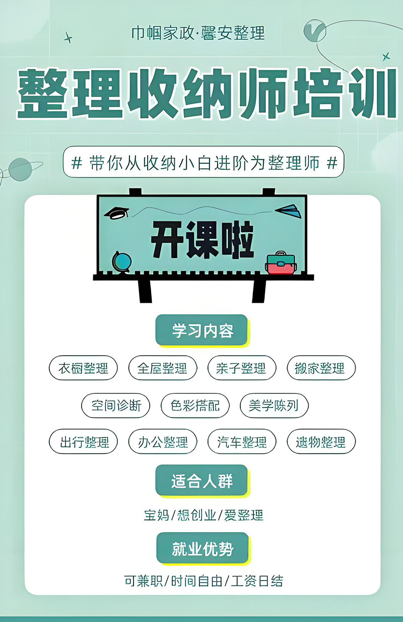 洛阳巾帼家政服务有限公司秉持 “客户为上、诚信服务” 的理念,其管理团队专业,服务人员素质高,均持三证上岗。在这里参加整理收纳师培训,不仅能学到扎实的专业技能,培训结束后还会安排实习并推荐工作 。此外,长期培训月嫂、催乳师、育婴师、养老护理等课程,外地学员还免费提供食宿。如果你有爱心、有责任心,并有志于从事家政服务行业,不妨加入洛阳巾帼家政,开启你的职业新旅程!